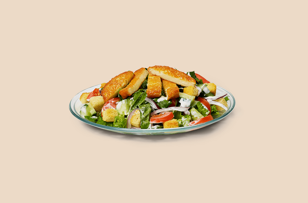En frisk salat med agurk, rødløk, cherrytomater og krutonger.. Toppet med halloumi og en av våre deilige dressinger. Velg din favoritt! Serveres med en 33 cl drikke.