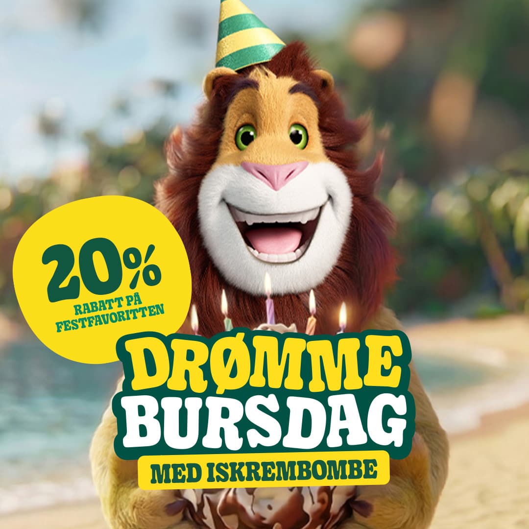 Feir bursdagen din med alle vennene dine hos Leo’s! Akkurat nå kan du få en Dream Party med iskake til 20 % rabatt. En virkelig flott festpakke med eget temarom, smakfull mat og hele Leo’s-jungelen å leke i.
